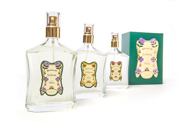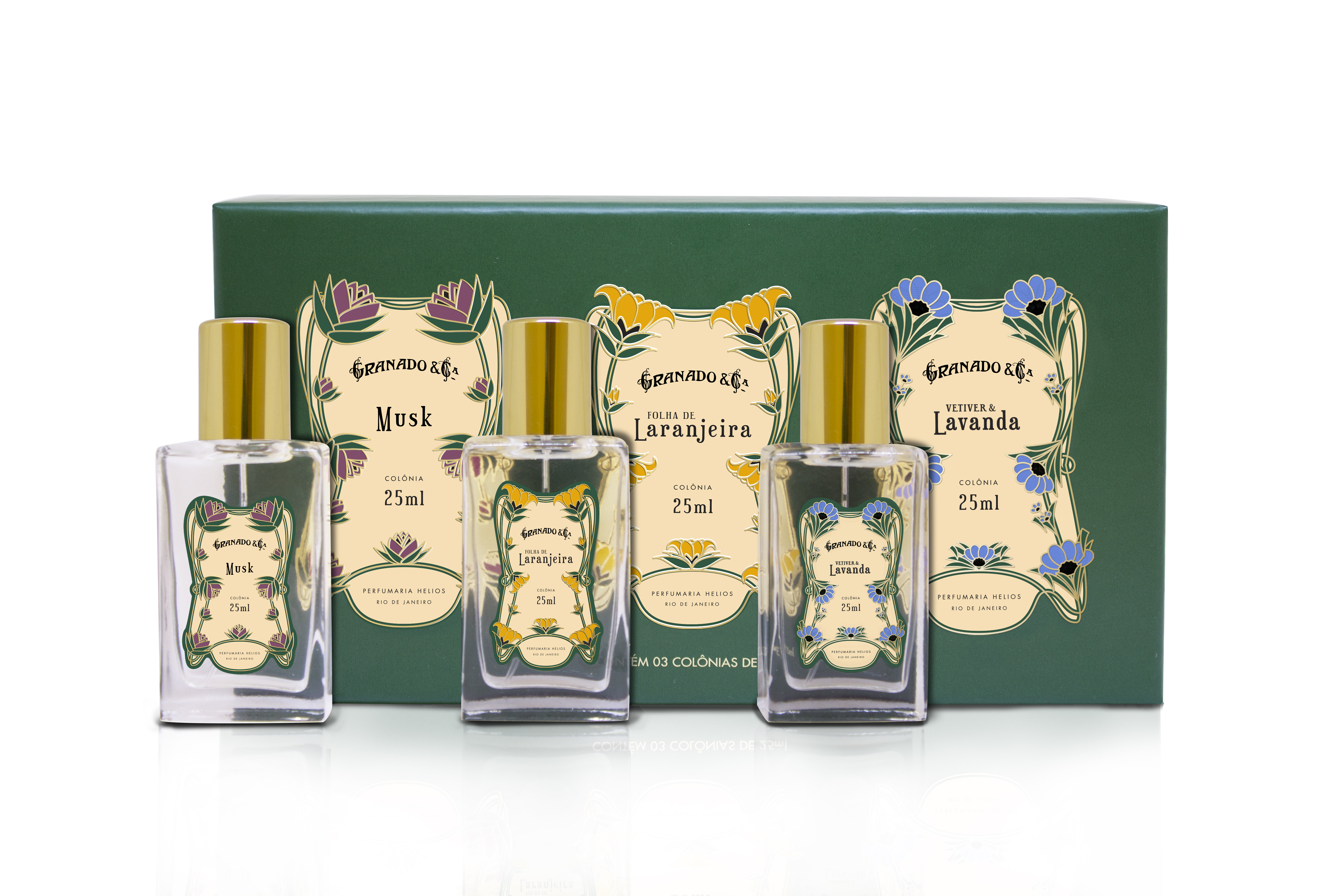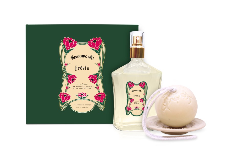 Para o layout da linha, me inspirei no movimento Art Nouveau, utilizando linhas sinuosas e orgânicas. Cada fragrância traz a assinatura de uma flor presente em sua pirâmide olfativa.